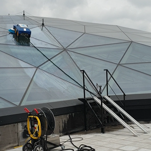Ook de bewassing van een recent opgeleverde glaskoepel te Amsterdam West zal gemechaniseerd worden uitgevoerd met behulp van een op afstand bestuurbaar wasrobot…