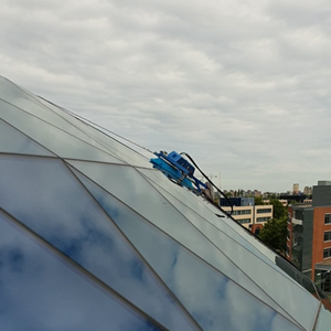 Na afronding van werkzaamheden is het radiografische bestuurbare was-robotsysteem voor de glazen theaterkoepel van het AFAS-Experience Center te Leusden in bedr…